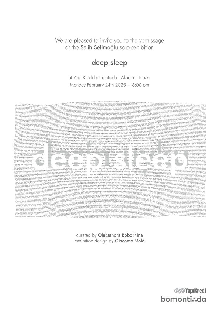 Ziyaretçileri, eserle zihinsel bir etkileşime sokarak kolektif bir anma sürecinin parçası olmaya davet eden Salih Selimoğlu, ‘Derin Uyku’ adlı enstalasyon sergisi ile çift yönlü bir duruma işaret ediyor. Derin Uyku bir yanda, bireylerin trajik ve yıkıcı haberlerle karşılaştığında hissettiği duygusal hissizliği ve bir tür korunma mekanizması olarak içine çekildiği “uyku” halini simgeliyor. Diğer yanda ise, savaşın ortasında yaşamları aniden sönen çocukların trajik kaderine ve onların sonsuz bir dinlenme haline işaret ediyor.
