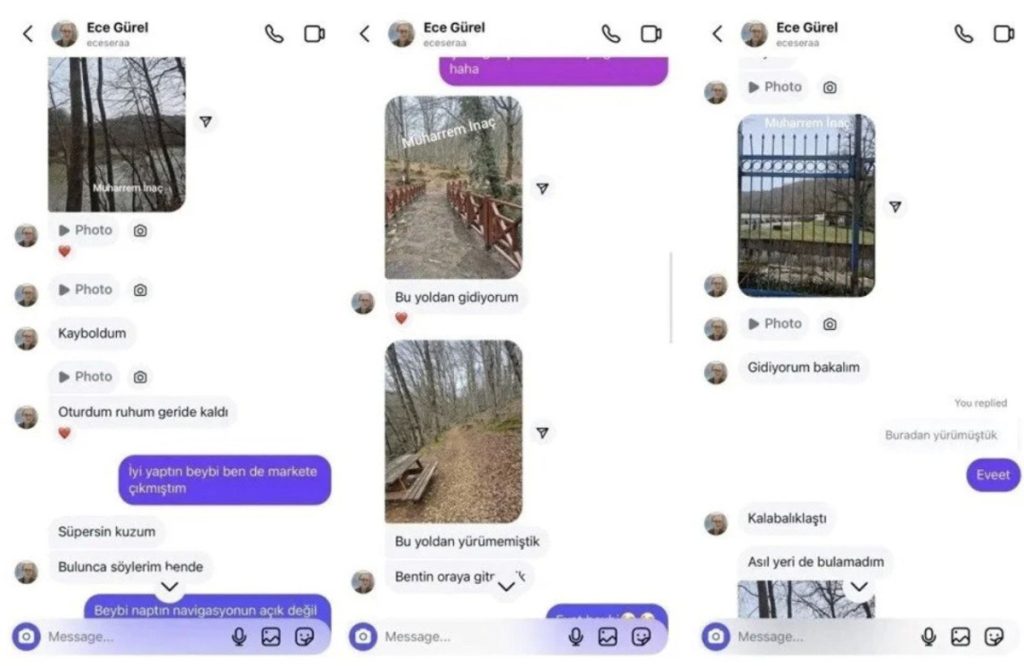 Gürel’in kendisine ilk olarak Atatürk Arboretumu’na gideceğini söylediğini ancak sonrasında karar değiştirdiğini ve Belgrad Ormanı’na gittiğini belirten Özge A.Ö., “Bana ‘Ormana gitmek nefes almak, hava almak istiyorum’ dedi. Orada daha önce birlikte gittiğimiz yerlerden bana fotoğraflar attı.