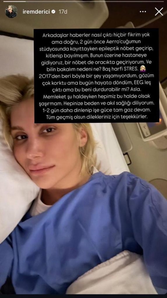 Derici, hastane odasından bir fotoğrafla birlikte yayınladığı mesajına; ”Arkadaşlar haberler nasıl çıktı hiçbir fikrim yok ama doğru. 2 gün önce stüdyoda kayıttayken epileptik nöbet geçirip kitlenip bayılmışım. Bunun üzerine hastaneye gidiyoruz, bir nöbet de oracıkta geçiriyorum. Ve bilin bakalım nedeni ne? Baş harfi stres. 2017’den beri böyle bir şey yaşamıyordum. Gözüm çok korktu ama bugün hayata döndüm.” notunu düştü.