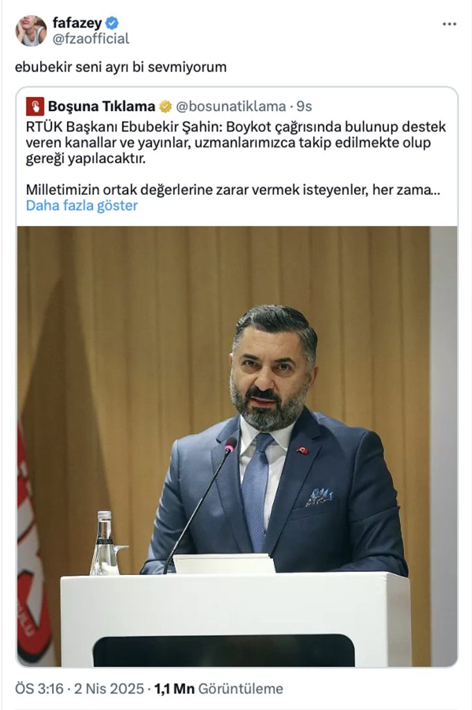 Boykot çağrısı verip paylaşan kanalların yakından takip edildiğini ve gereğinin yapılacağını vurgulayan RTÜK Başkanı Ebubekir Şahin'e bir tepki de ünlü oyuncu Farah Zeynep Abdullah'tan geldi.