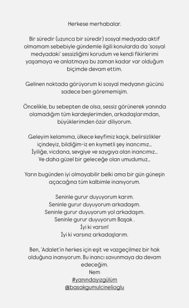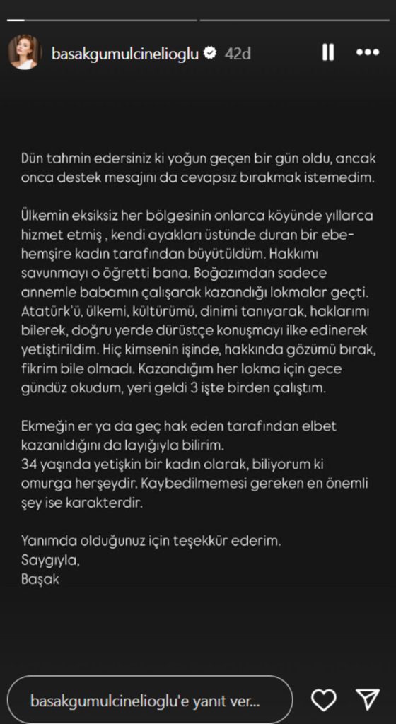 Başak Gümülcinelioğlu bir açıklama yaparak; “Dün oldukça yoğun bir gündü. Ancak gelen sayısız destek mesajını cevapsız bırakmak istemedim. Ülkemin dört bir yanındaki köylerde yıllarca hizmet vermiş, kendi ayakları üzerinde duran bir ebe – hemşirenin kızı olarak büyüdüm. Annem, bana hakkımı savunmayı öğretti. Boğazımdan sadece ailemin emeğiyle kazanılmış lokmalar geçti” dedi.