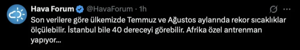 Sıcaklıkların rekor kırabileceğini belirten Hava Forum, paylaşımında “Son verilere göre ülkemizde Temmuz ve Ağustos aylarında rekor sıcaklıklar ölçülebilir. İstanbul bile 40 dereceyi görebilir. Afrika özel antrenman yapıyor…” ifadelerini kullandı.