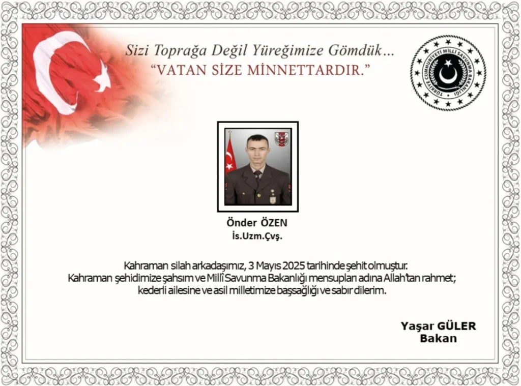 “Irak’ın kuzeyindeki Pençe (Hakurk) Operasyon bölgesinde icra edilen arama tarama faaliyeti esnasında mayın/EYP’ye basması sonucu yaralanan kahraman silah arkadaşımız Uzman Çavuş Önder Özen, yapılan tüm müdahalelere rağmen kurtarılamayarak 3 Mayıs’ta şehit olmuştur.”