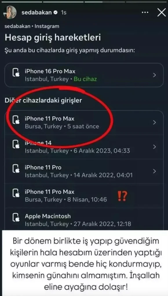 Instagram’da hesabına yapılan girişleri gösteren bir fotoğraf yayınlayan Seda Bakan,“Bir dönem birlikte iş yapıp güvendiğim kişilerin hala hesabım üzerinden yaptığı oyunlar varmış, ben de hiç konduramayıp, kimsenin günahını almamıştım. İnşallah elin ayağına dolaşır!” dedi.