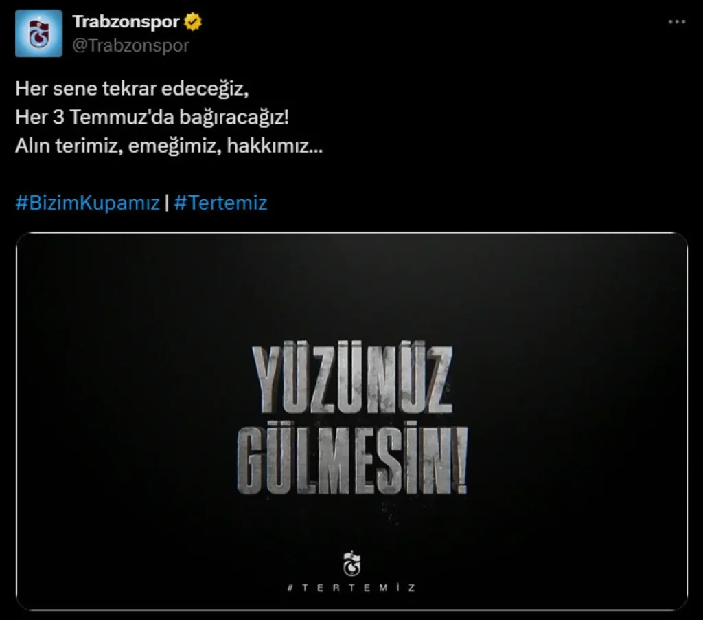 Trabzonspor’un açıklamasında ise “Her sene tekrar edeceğiz. Her 3 Temmuz’da bağıracağız! Alın terimiz, emeğimiz, hakkımız…” denildi.