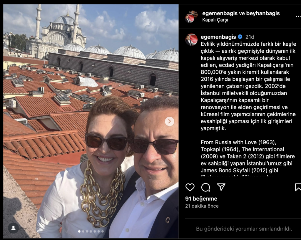 Egemen Bağış, eşiyle birlikte evlilik yıldönümünü özel bir keşfe çıkarak kutladı ve bu anı sosyal medyada paylaştığı fotoğraflarla ölümsüzleştirdi.