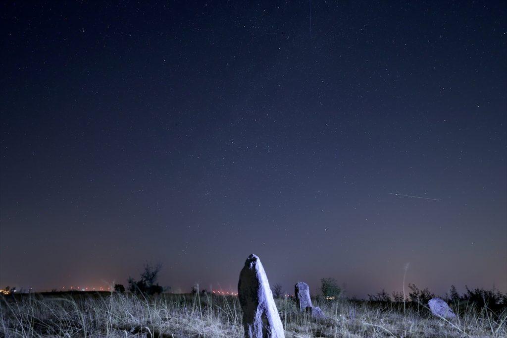 Edirne’nin Lalapaşa ilçesine bağlı Çömlekakpınar köyündeki dolmen alanında, gece saatlerinde gökyüzünde gerçekleşen meteor yağmuru, uzun pozlama tekniğiyle görüntülendi.