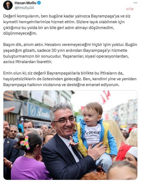 “Bugün yaşadığım gözaltı, sadece 30 yılın ardından Bayrampaşa’yı hizmetle buluşturmamızın bir sonucudur. Yaşananlar; siyasi operasyonlardan, asılsız iftiralardan ibarettir. Emin olun ki; siz değerli Bayrampaşalılarla birlikte bu iftiraların da haysiyetsizliklerin de üstesinden geleceğiz. Ben, kendimi yine ve yeniden Bayrampaşa halkının vicdanına ve desteğine emanet ediyorum.”