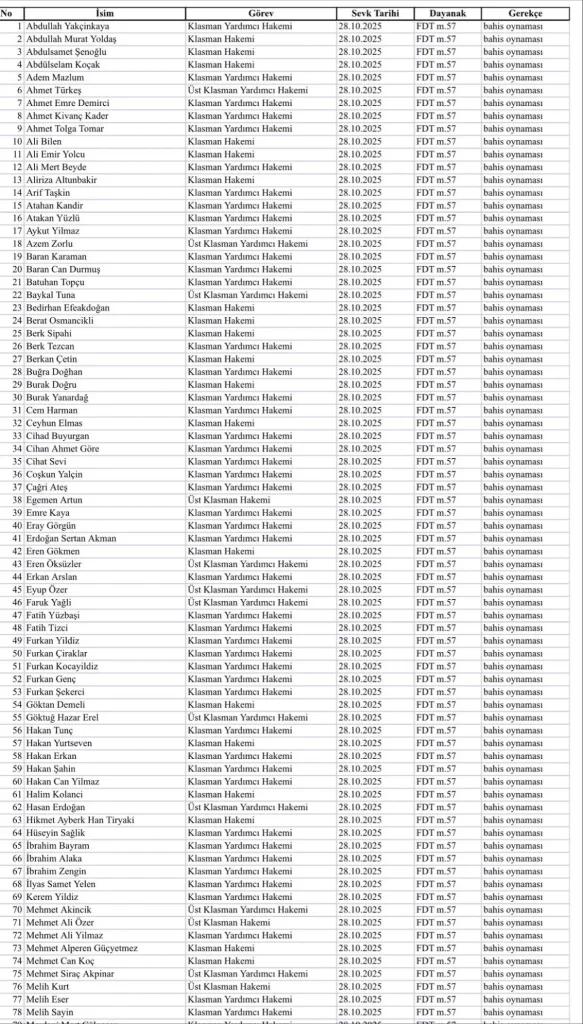 52- Klasman Yardımcı Hakemi FURKAN GENÇ’in futbol müsabakalarına ilişkin “bahis oynaması” nedeniyle Futbol Disiplin Talimatı’nın 57. maddesi uyarınca 28.10.2025 tarihinden itibaren tedbirli olarak PFDK’ya sevkine karar verilmiştir.