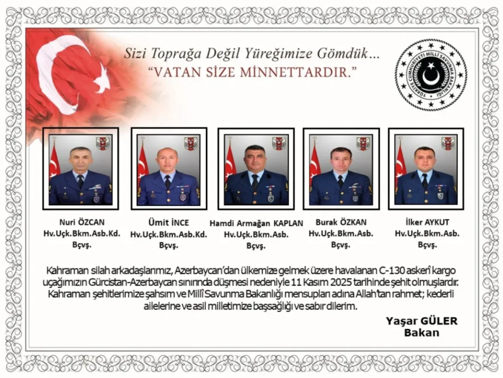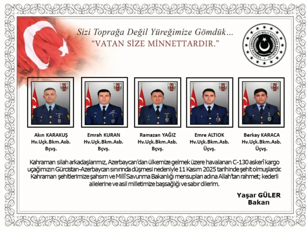 “Kahraman silah arkadaşlarımız, Azerbaycan’dan ülkemize gelmek üzere havalanan C130 askeri kargo uçağımızın Gürcistan-Azerbaycan sınırında düşmesi nedeniyle 11 Kasım 2025 tarihinde şehit olmuşlardır.