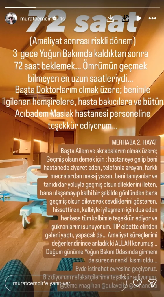Sağlık sorunlarını atlatan ve evde dinlenmeye geçen Murat Cemcir’den ilk paylaşım geldi. Cemcir, “3 gece yoğun bakımda kaldıktan sonra. 72 saat beklemek… Ömrümün geçmek bilmeyen en uzun saatleriydi… Başta doktorlarım olmak üzere; benimle ilgilenen hemşirelere, hasta bakıcılara ve bütün hastanesi personeline teşekkür ediyorum.” yazdı.
